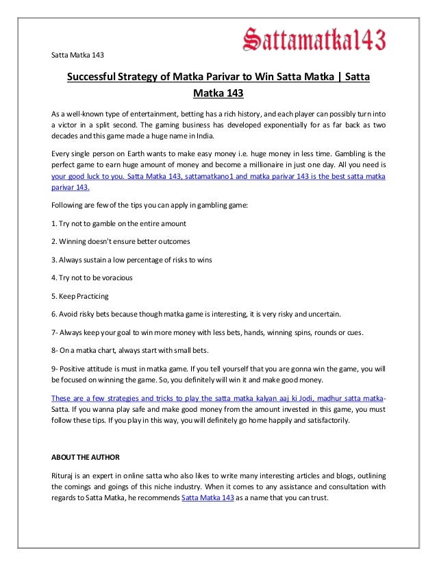 Successful Strategy Of Matka Parivar To Win Satta Matka Satta Matka See more of satta matka 143 on facebook.